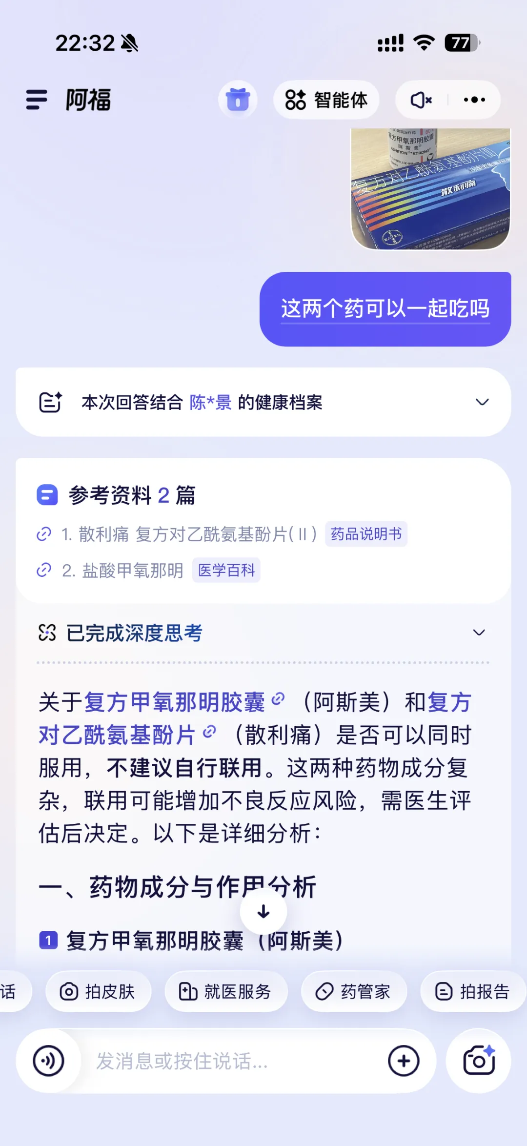 AI会快速识别并展示核心信息,还会提醒是否有潜在的用药风险,比如两种药品能否同服、保健品是否适合老年人。