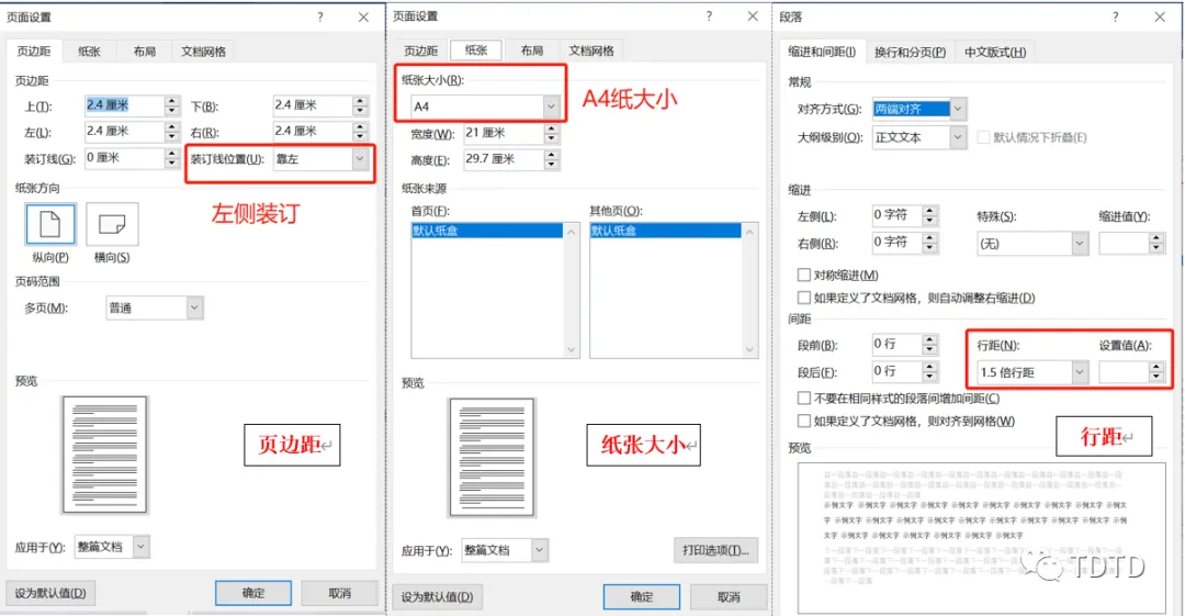 操作:在【布局】选项卡,点击【页面设置】右下角的箭头,找到【页边距】和【纸张】进行设置;点击【段落】组右下角的箭头,找到【缩进和间距】中的【行距】设置1.5倍行距。