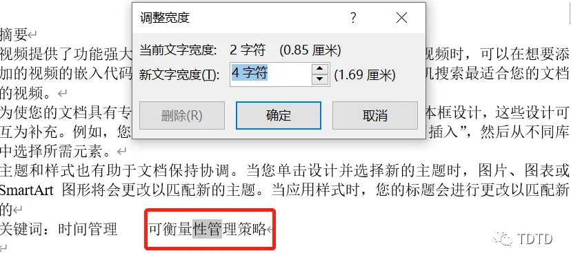 操作:选中需要设置字距的两个字,在【开始】选项卡【段落】组找到【分散对齐】,点击后,新文字宽度设置为4字符。