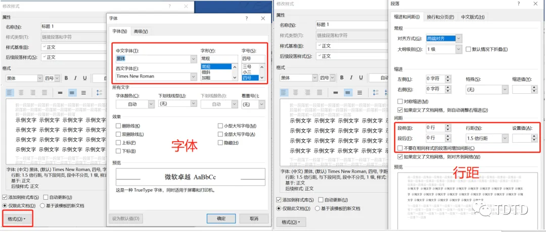 选择左下角的【格式】,设置标题1的字体和段落间距等,由于行距并未说明,所以我们按照页面设置中的要求设为1.5倍行距,段前段后的间距也设为0,直接写0,回车即可。