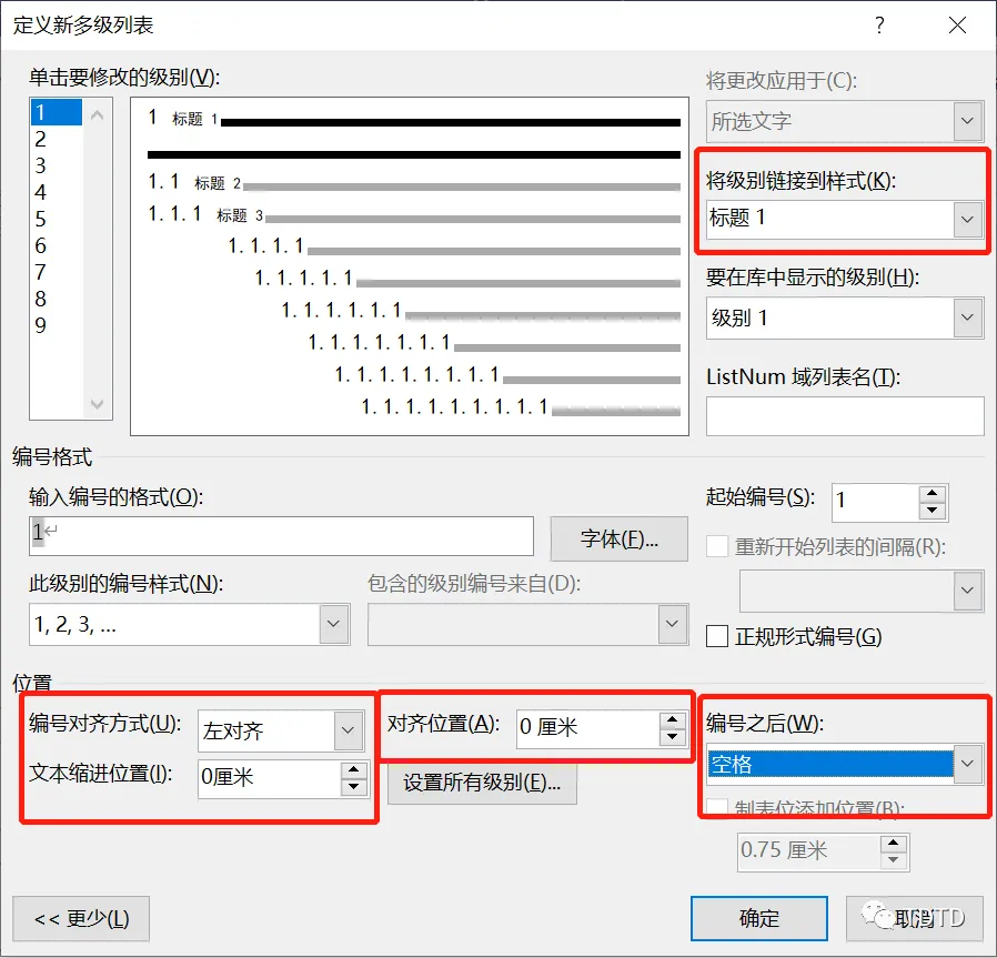 由于标题序号要求左对齐,所以在【编号对齐方式】选择【左对齐】,【文本缩进位置】【对齐位置】都改为0。