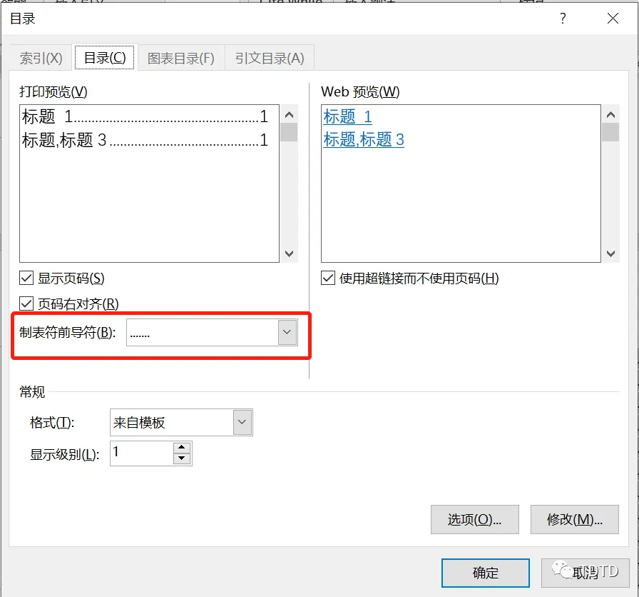 制表符的前导符(就是目录中页码前的点点)样式可在【自定义目录界面】设置。