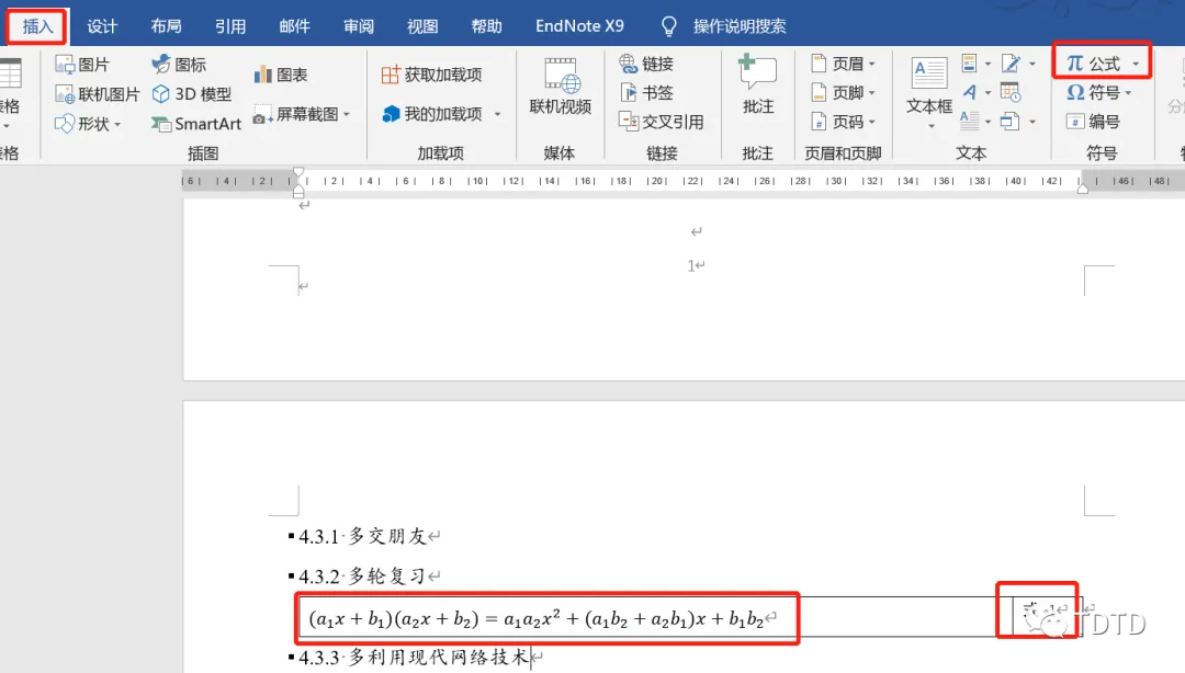 论文中有时需要插入公式,这不需要手动敲击,Word中就自带了常用的公式。
