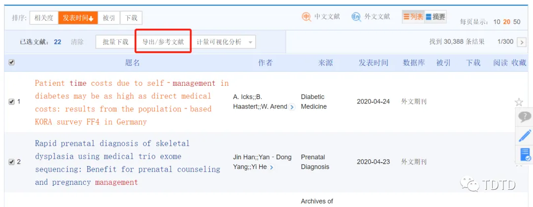 操作:搜索文献,勾选所需文献,点击【导出/参考文献】,选择需要的文献格式,将文献格式导出为txt/doc格式均可。