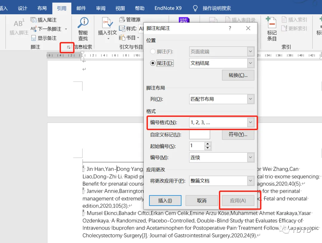 操作:【引用】选项卡中找到【脚注】组右下方的箭头,在弹出的窗口将编号格式改为阿拉伯数字。这会将文中和文末的尾注数字都改为阿拉伯数字。