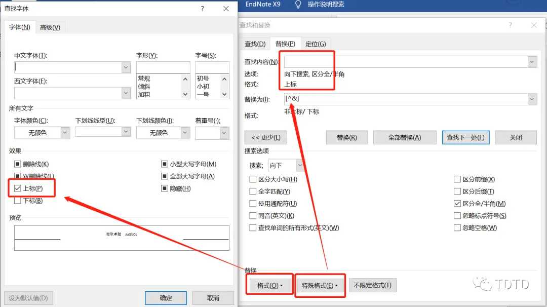 点击查找内容,在下方【格式】【字体】勾选上标。
