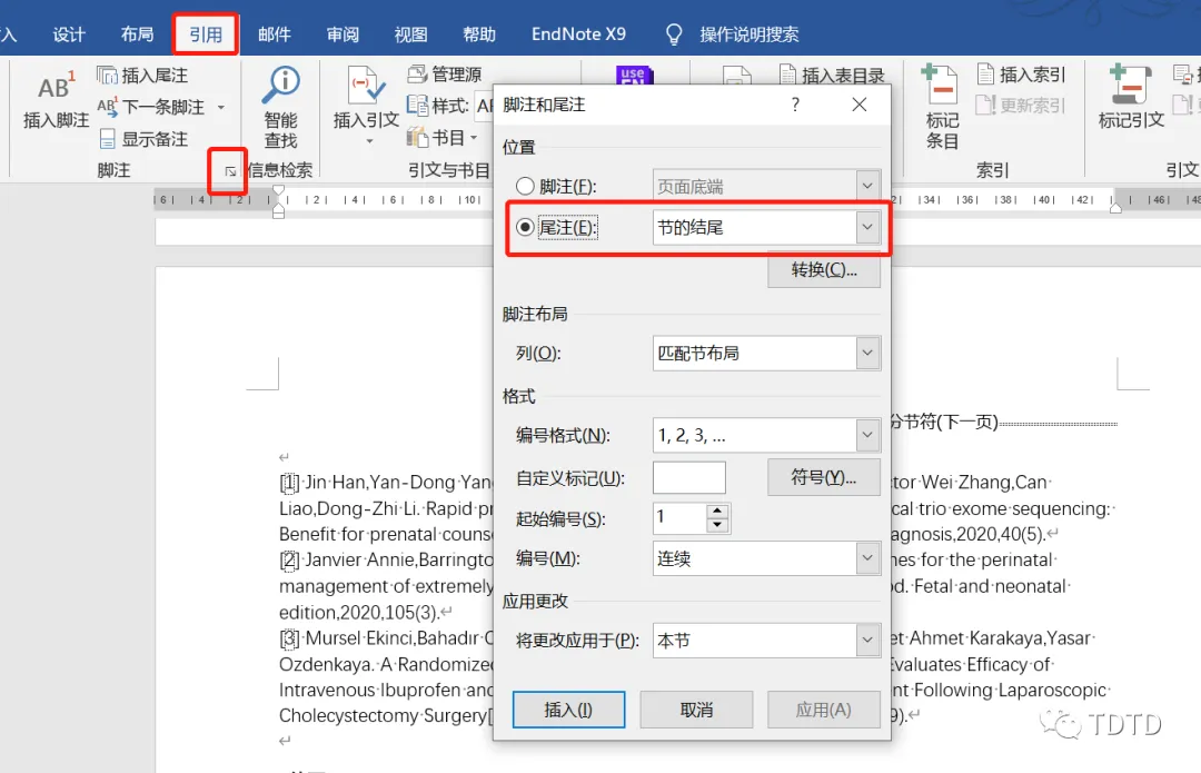 由于尾注默认是在文档的最后,但是我们知道参考文献后面还有附录和致谢,为了让参考文献的标题和文献连在一起,我们需要在”参考文献”后插入一个分节符,并将尾注的格式应用于节的结尾。