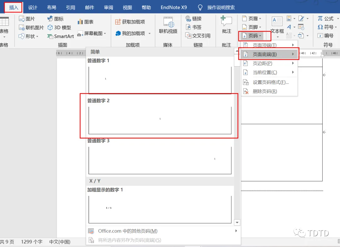 操作:在封面后点击【插入】选项卡,【页码】根据要求选择【页面底端】,找到需要的格式。