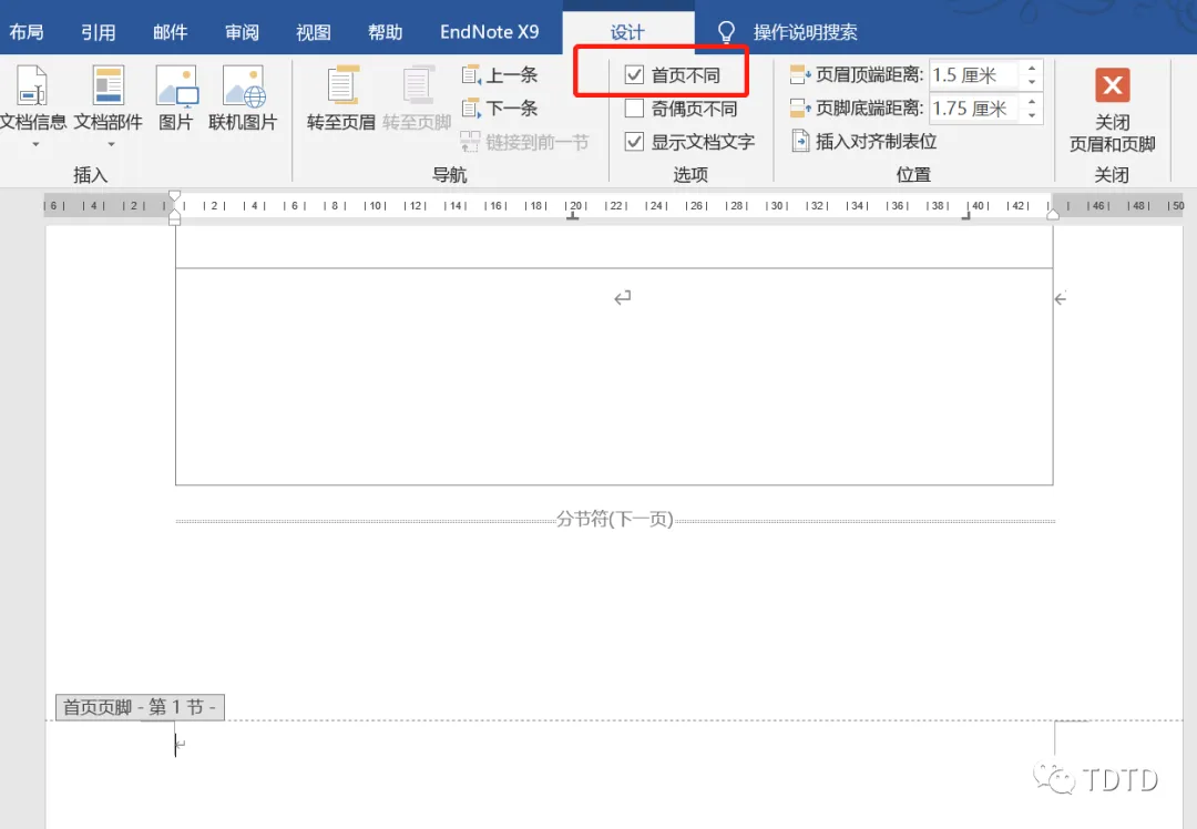 由于封面不需要页码,我们再次点击页面下方刚生成的页码,在弹出的【设计】选项卡勾选【首页不同】去除页码。