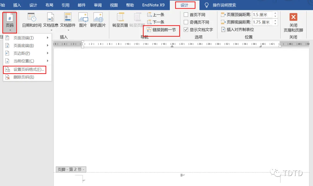 操作:同样双击英文摘要页底部,在弹出的【设计】选项卡,取消勾选【链接到前一节】点击【页码】【设置页码格式】,编号格式中选择罗马数字,起始页码为1。