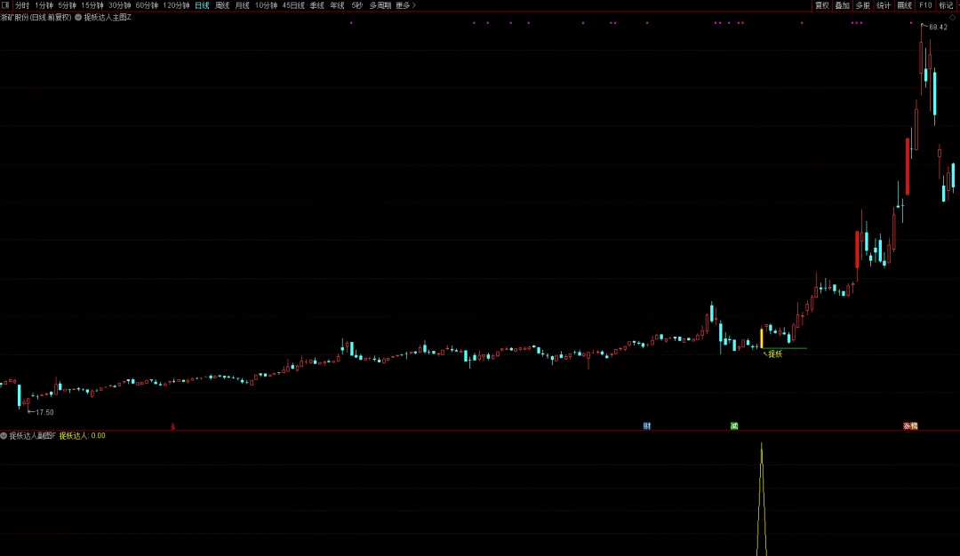 ZT:=C=H AND C>=ZTPRICE(REF(C,1),IF(CODELIKE(’60’) OR CODELIKE(’00’),0.1,IF(CODELIKE(’30’) OR CODELIKE(’68’),0.2,10)));STICKLINE(ZT,O,C,1,0),COLORRED;DCZ1:=CLOSE*VOL;DCZ2:=EMA((EXPMA(DCZ1,23)/EXPMA(VOL,23)+EXPMA(DCZ1,54)/EXPMA(VOL,54)+EXPMA(DCZ1,108)/EXPMA(VOL,108)+EXPMA(DCZ1,316)/EXPMA(VOL,316))/4,34);DCZ3:=1.0668*DCZ2;DCZ4:=CROSS(C,DCZ3) AND REF(C,1)*1.05-C<0.008 AND C>O*0.5;DCZ5:=DCZ4;DCZ6:=ABS(((3.48*CLOSE+HIGH+LOW)/4-EMA(CLOSE,23))/EMA(CLOSE,23));DCZ7:=DMA(((2.15*CLOSE+LOW+HIGH)/4),DCZ6);DCZ8:=EMA(DCZ7,200)*1.118;DCZ9:=EMA(DCZ7,200)*1.118;DCZ10:=(C-REF(C,1))/REF(C,1)*100>8;DCZ11:=CROSS(C,DCZ8) AND DCZ10;DCZ12:=MA(C,5);DCZ13:=MA(C,30);DCZ14:=MA(C,5);DCZ15:=MA(C,34);DCZ16:=SMA(EMA((DCZ14-REF(DCZ14,1))/REF(DCZ14,1),3)*100,3,1);DCZ17:=EMA((DCZ16-REF(DCZ16,1)),3);DCZ18:=(C-DCZ12)/DCZ12*100;乖离率:=(C-DCZ15)/DCZ15*100;DCZ19:=COUNT(CROSS(DCZ18,0),3)>=1 AND 乖离率>REF(乖离率,1) AND DCZ12>REF(DCZ12,1) AND (C/REF(C,1)-1)*100>5 AND REF(C,1)DCZ20:=FILTER(DCZ19,10);大成:=CODELIKE(’60’)||CODELIKE(’00’)||CODELIKE(’30’);非涨停:=C捉妖达人:=DCZ5 AND DCZ11 AND DCZ20 AND 大成 AND 非涨停;STICKLINE(捉妖达人,O,C,1,0),COLORYELLOW;DRAWTEXT(捉妖达人,L*0.97,’ ↖捉妖’),COLORYELLOW;DRAWSL(捉妖达人,L,0,10,0),COLORGREEN;