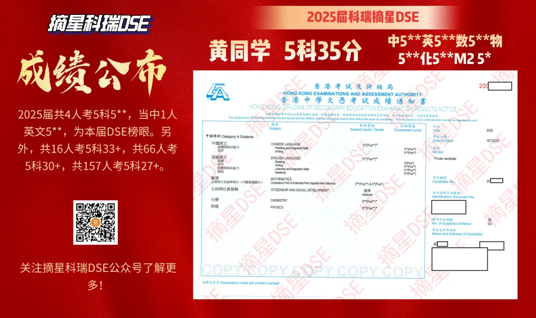 港三大率90%+!25DSE黄同学考出5科5**榜眼