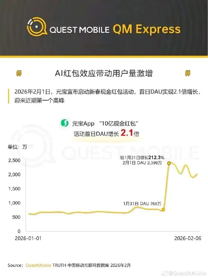 最早启动现金红包活动的元宝在活动首日(2 月 1 日)DAU 规模为 2399 万,较前一日增长 2.1 倍。