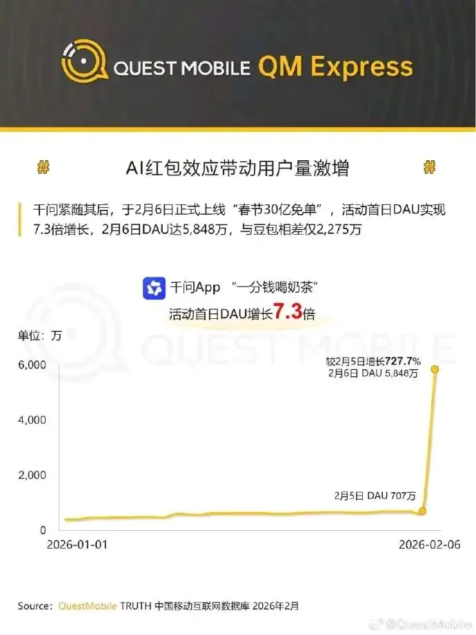 据QuestMobile发布数据,新春活动启动首日(2 月 6 日),千问 App 日活跃用户(DAU)增长 727.7%,达 5848 万,比前一天多出超 5100 万。