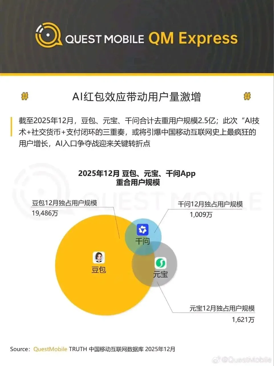 红包大战首日战报出炉虽然千问一天增长 5100万日活用户,但是据大模型App排名TOP3来看为:豆包、DeepSeek、元宝,千问依然未入大模型App三强,还需继续努力。