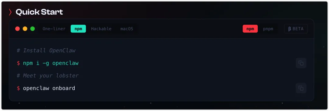 Bash # Install OpenClaw (beta) — Fresh from the lab 🧪npm i -g openclaw@beta # Meet your experimental lobsteropenclaw onboard |