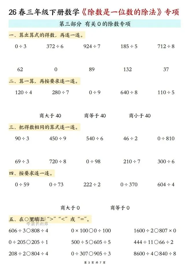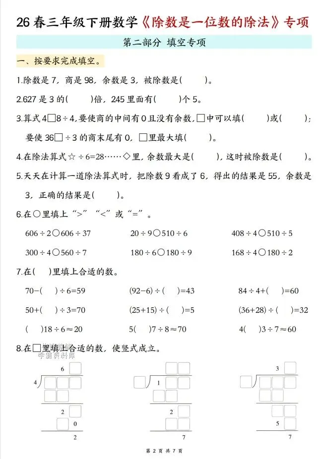 今天给大家整理了26春三年级下册数学除数是一位数的除法专项,转发给朋友或班级群,受益更多人,帮助孩子学习!