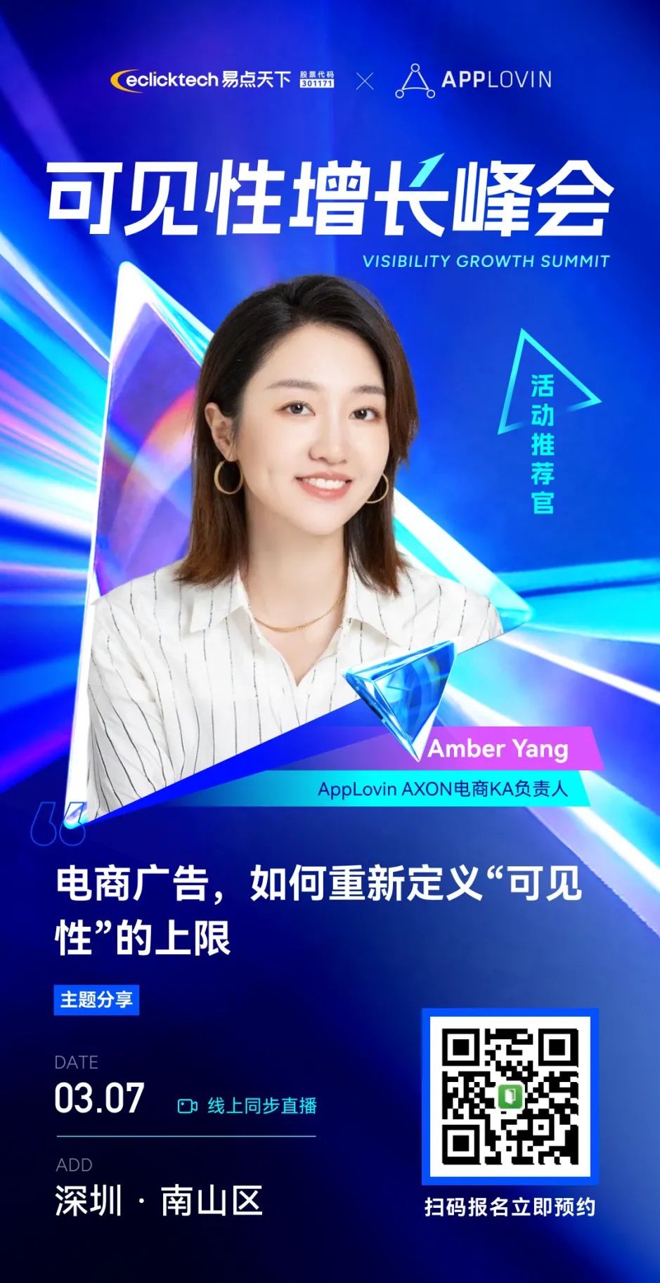 在3月7日下午【可见性×广告】专场,易点天下特邀AppLovin Axon电商KA负责人 Amber Yang到场,作为主题演讲嘉宾,共同探讨电商广告如何重新定义“可见性”的上限,以及Axon平台如何驱动最优的商业结果。