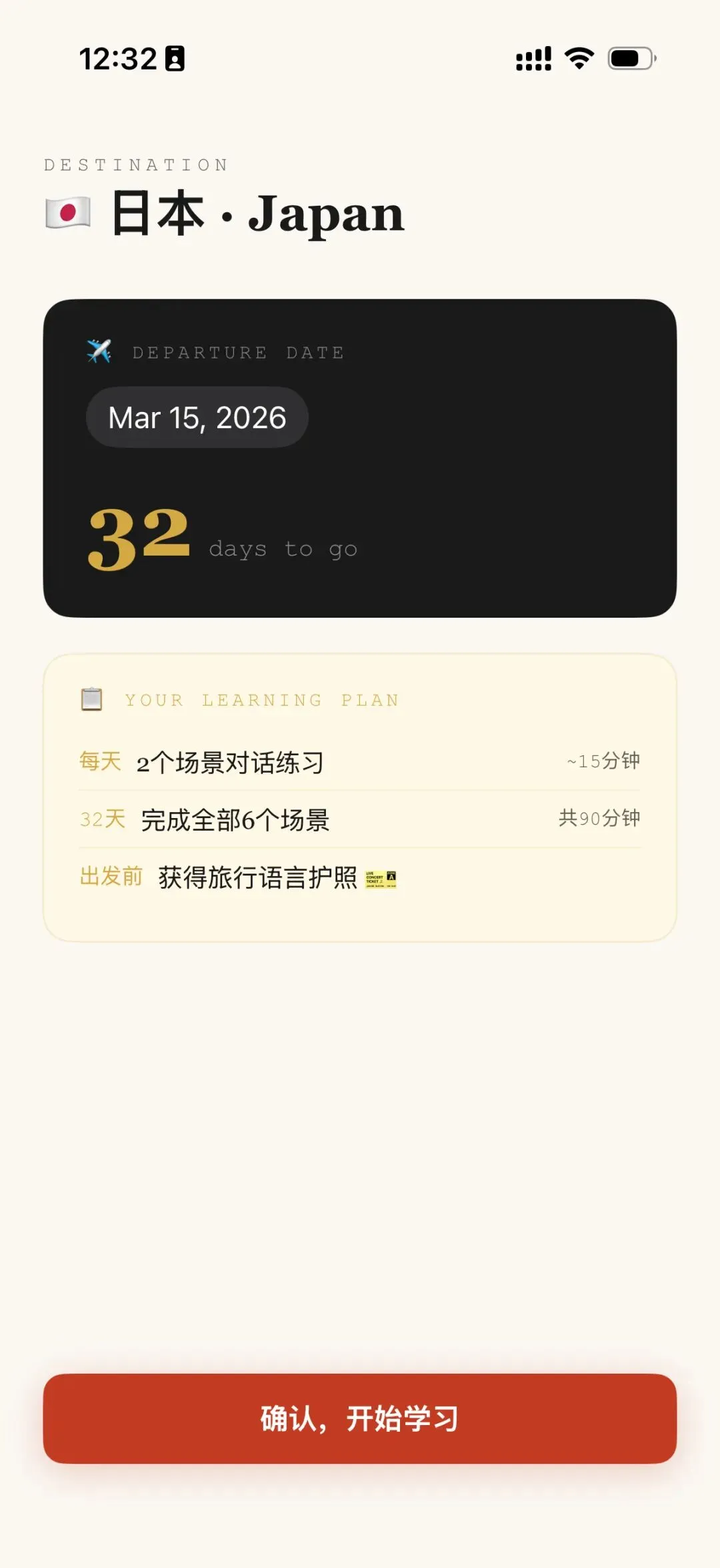 设好出发日期,App显示”还有7天”,每天推两个场景。到出发那天,最高频的对话你都练过了。海关问你 “What’s the purpose of your visit?”,你脱口而出 “Business trip, five days.”