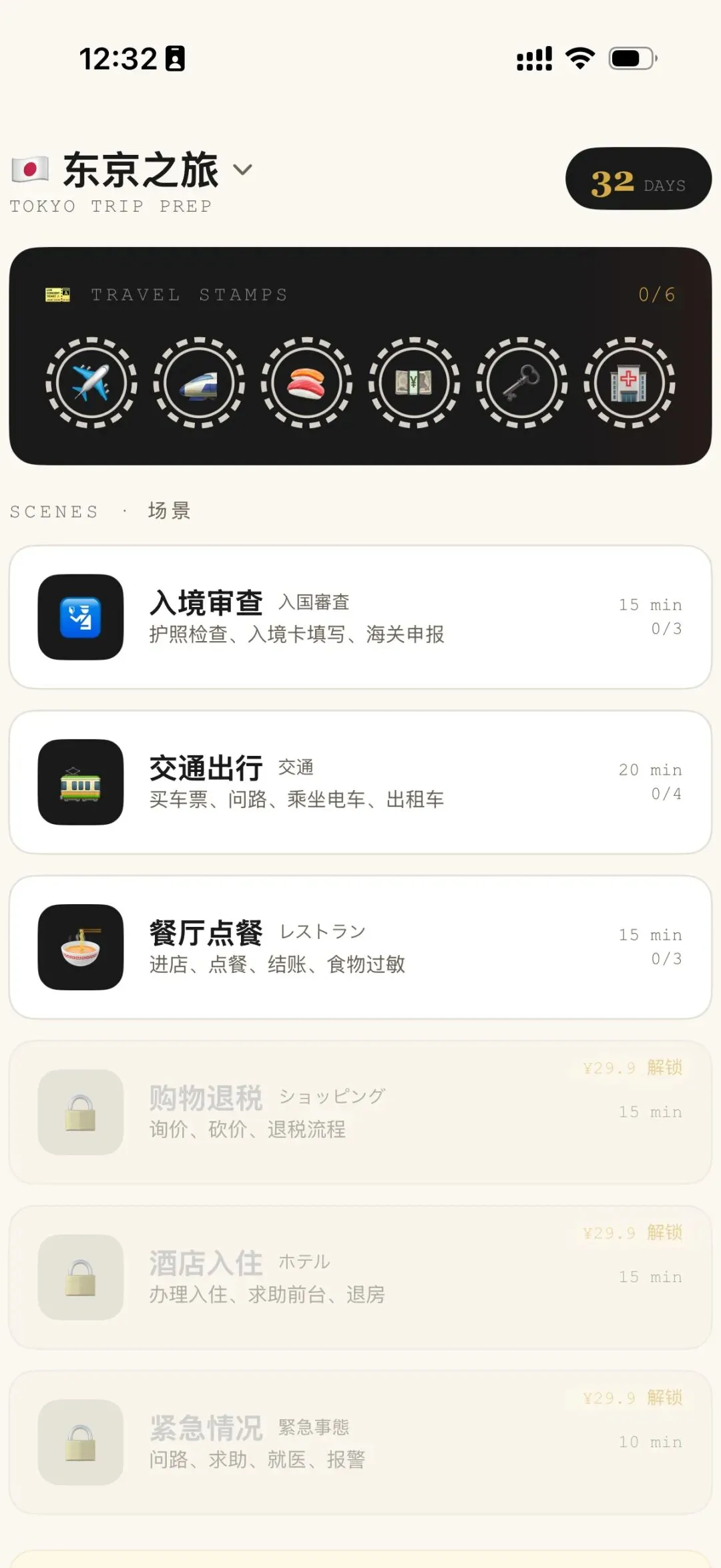不教语法,不背单词,不搞排行榜。就模拟你出国后真正会遇到的对话:过海关怎么说、点菜怎么说、打车怎么说。每个场景2-3分钟,总共一个多小时全部”通关”。