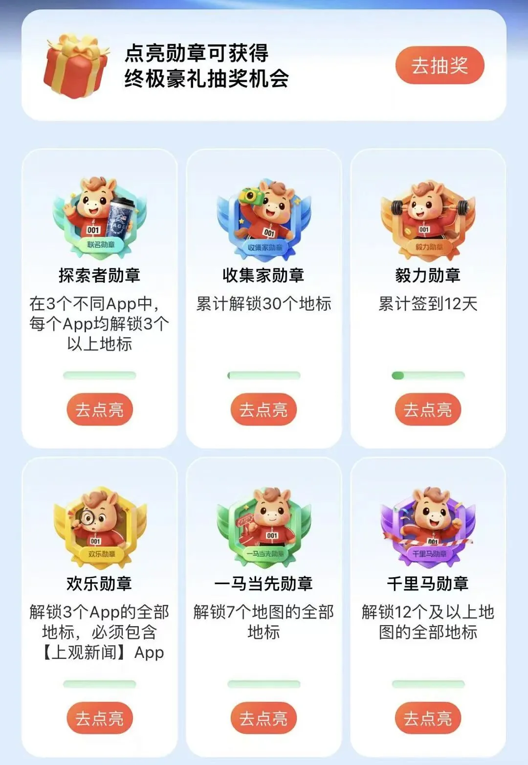 欢乐勋章:解锁3个App的全部地标(其中必须包含上观新闻App),奖励300融耀值,并可额外兑换2次终极抽奖机会。