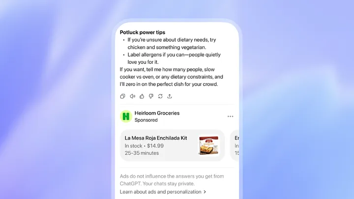 根据 OpenAI 此前的说法,ChatGPT 将会在免费以及 Go 订阅用户中打广告,且广告不会影响 ChatGPT 的回答,并会确保用户的对话对广告商保密,但还指出广告仍将根据对您最有帮助的内容进行优化。