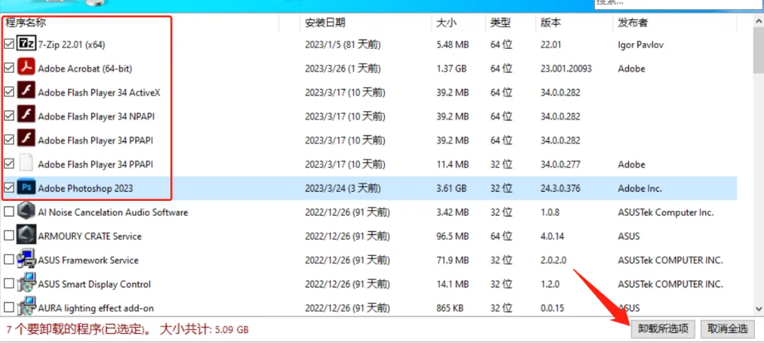 3、批量卸载,选择需要卸载的软件,点击“卸载所选项”