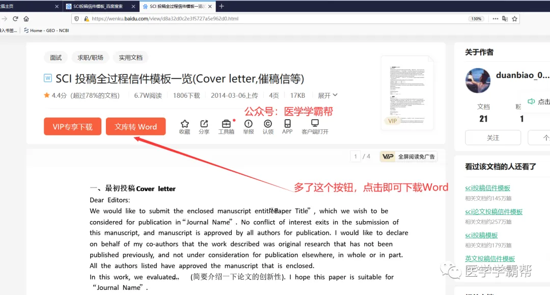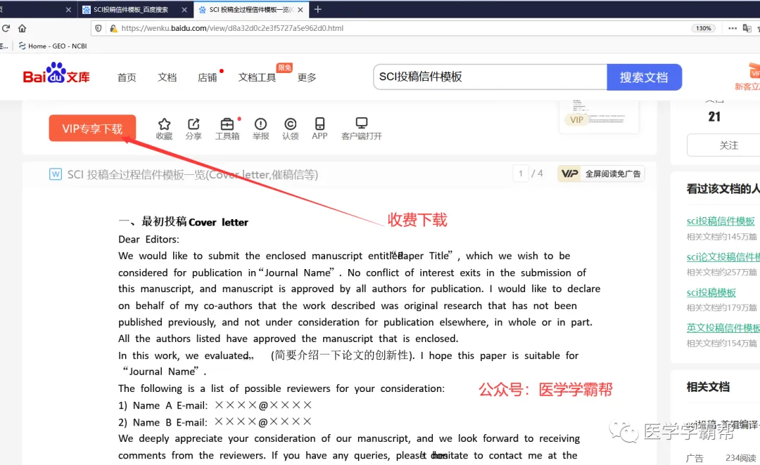 然后确实搜到了百度文库中Word格式的SCI投稿模板,都是非常需要的资源,然后点击打开,发现下载需要收费。