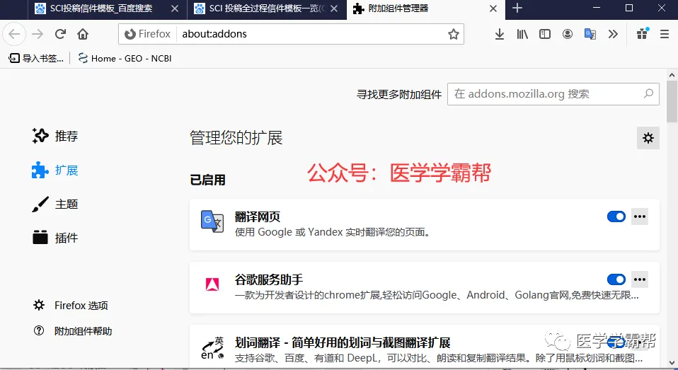 第一步:Chrome浏览器可以点击右上角-更多工具-扩展程序进入设置界面;而火狐浏览器点击右上角三个横杠-附加组件后进入设置界面;其他浏览器类似。