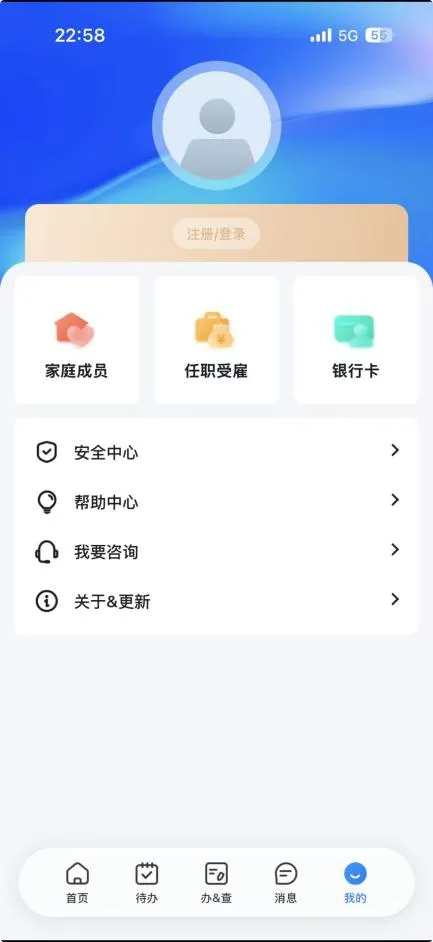 点击“我的”——“注册/登录” ,点击“注册”按钮。