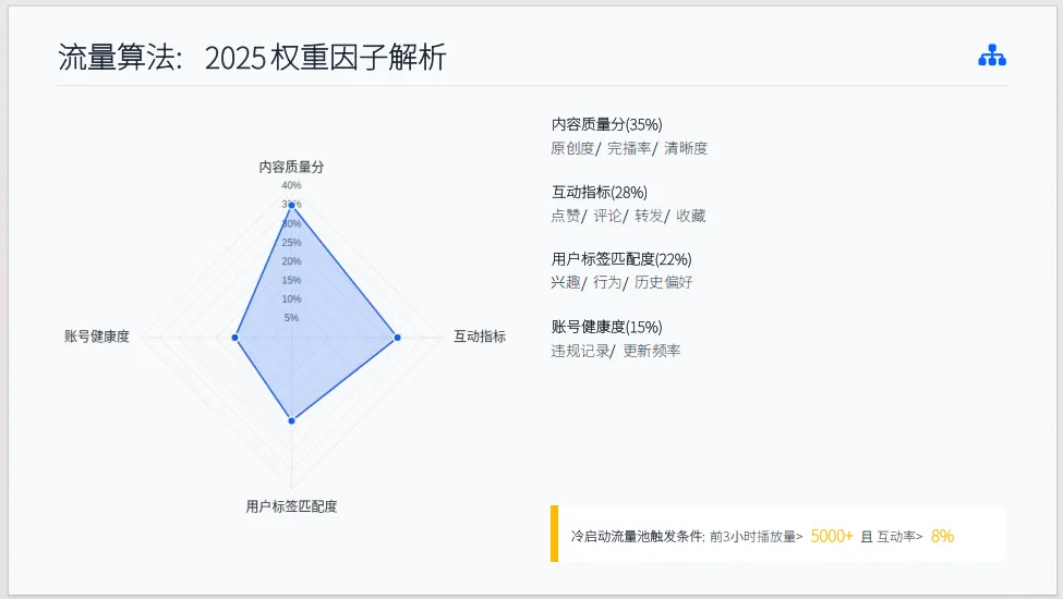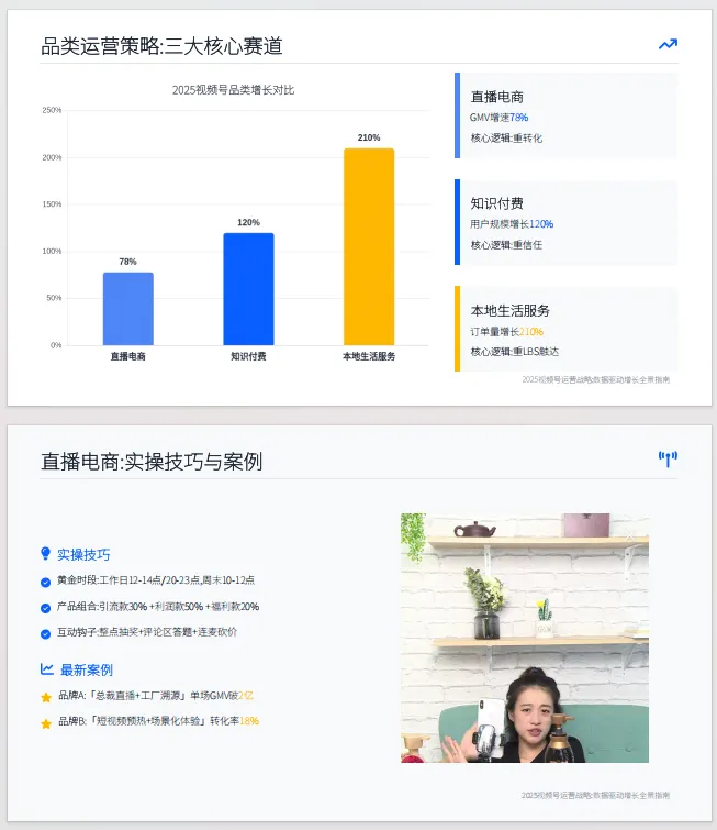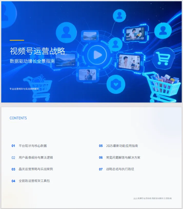 这份《2025视频号运营战略:数据驱动增长全景指南》系统阐述了视频号平台在2025年的核心数据、用户特征、算法机制、品类运营策略及配套工具方法。平台整体呈现强劲增长态势,月活跃用户突破12亿,日均使用时长42分钟,商业化规模达8000亿元,其中本地生活服务增长迅猛达210%。用户画像显示25-35岁群体占比41%是核心消费主力,用户消费能力稳步提升,中高消费占比58%,月均消费约620元。流量算法由内容质量、互动指标、用户标签匹配及账号健康度四大权重因子构成,指导内容创作需重视原创度、完播率和用户互动。运营策略聚焦三大高增长赛道:知识付费强调信任构建与内容模块化,本地生活服务依赖LBS精准触达与套餐设计,直播电商则注重时段选择与互动玩法。指南提供了包含内容日历与数据分析工具在内的全链路运营框架,并详解了AR虚拟试穿、AI智能剪辑、私域一键跳转等新功能如何分别提升转化、节省时间与增强用户沉淀。针对常见问题如账号限流申诉、内容审核规范及商业化启动条件提供了明确解决方案。最终战略路径总结为坚持以数据驱动为核心,结合功能创新与品类深耕,通过持续的用户分层、内容适配、工具提效与数据复盘来优化运营效率与增长效果。