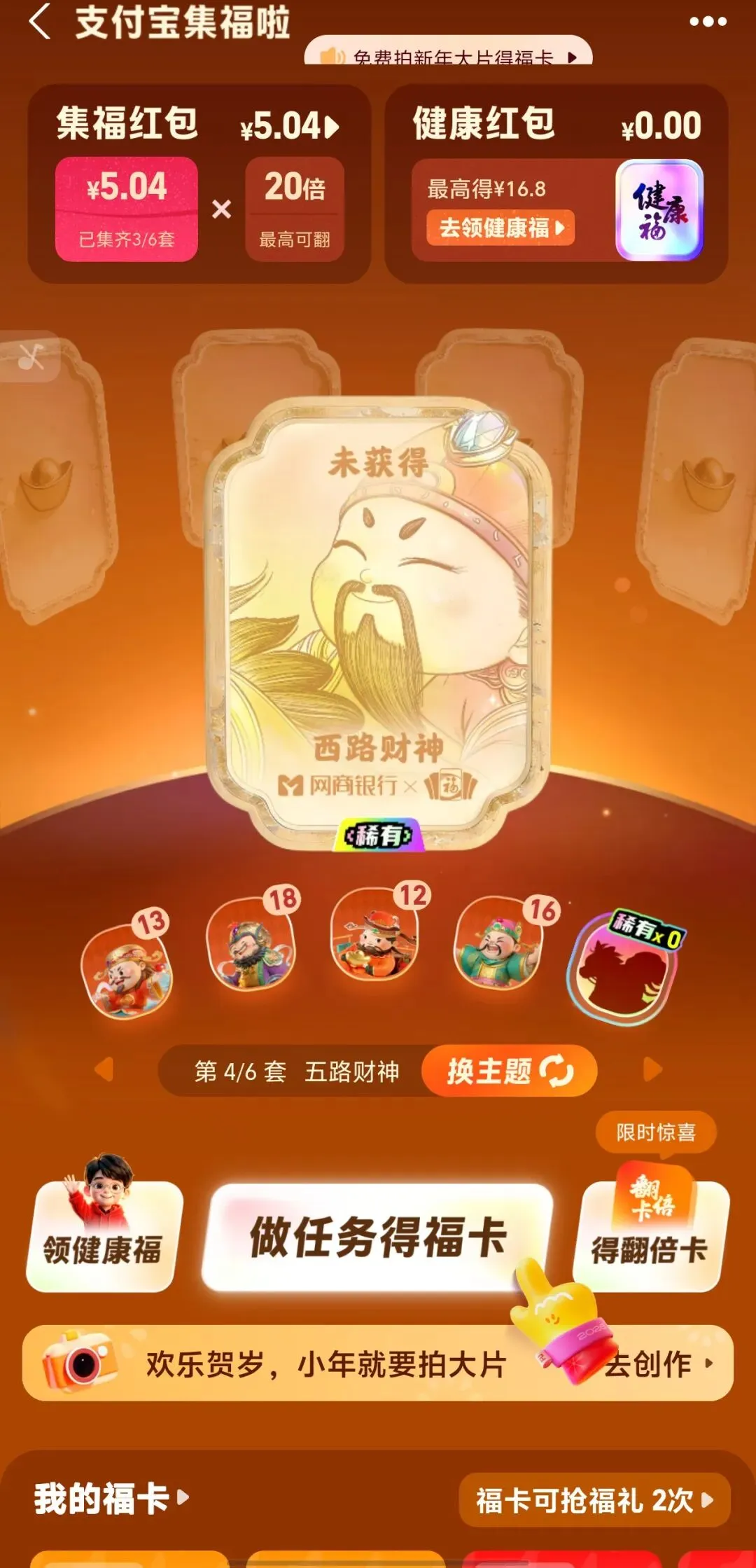 🧧支付宝五福:延续多年的五福活动,今年也与往年大不同,今年有翻倍卡(看脸)参与很容易,直接登陆支付宝首页横幅就是