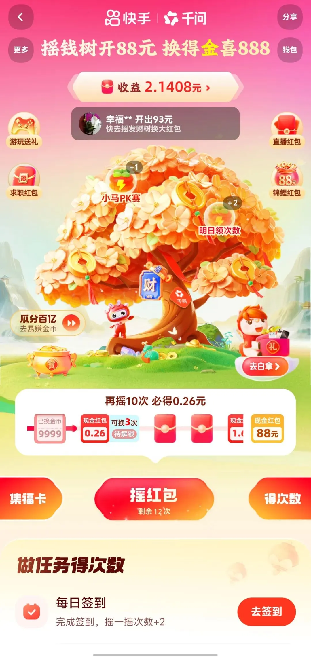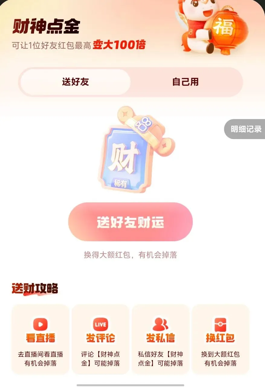 📱最后的快手摇钱树:登录快手APP,左上角三横,往下滑看到摇钱树字样,点进去就可以参与,还可以根据互动概率获得财神卡!最高翻100倍!