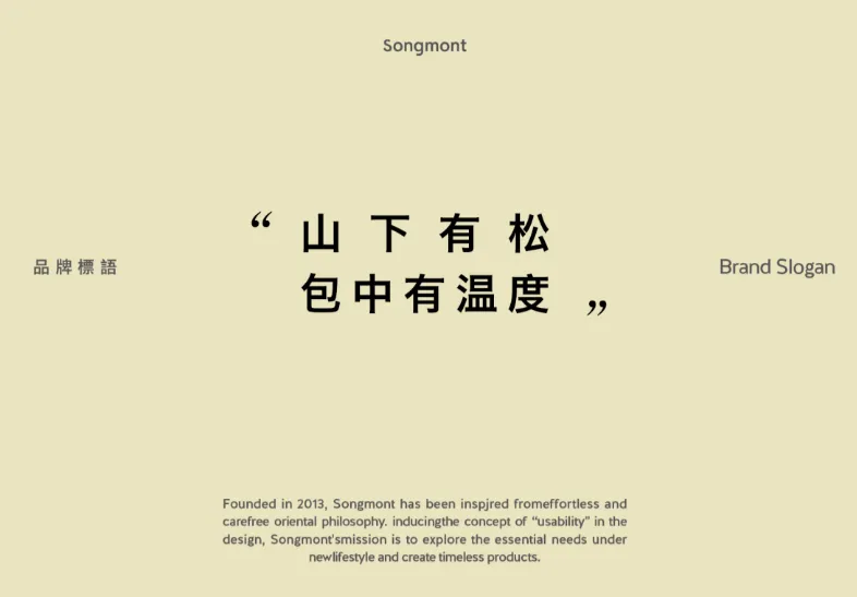 品牌之名 “Songmont 山下有松”,灵感源于东方美学经典意象 “天远山高,山下有松”。英文名称 “Songmont” 由 “SONG(松)” 与 “MOUNTAIN(山)” 组合而成。松与山,这两种深深扎根于中原文化的自然元素,不仅构建起品牌标识,更呼应着 Songmont 山下有松所尊崇的中原美学和精神内核 。