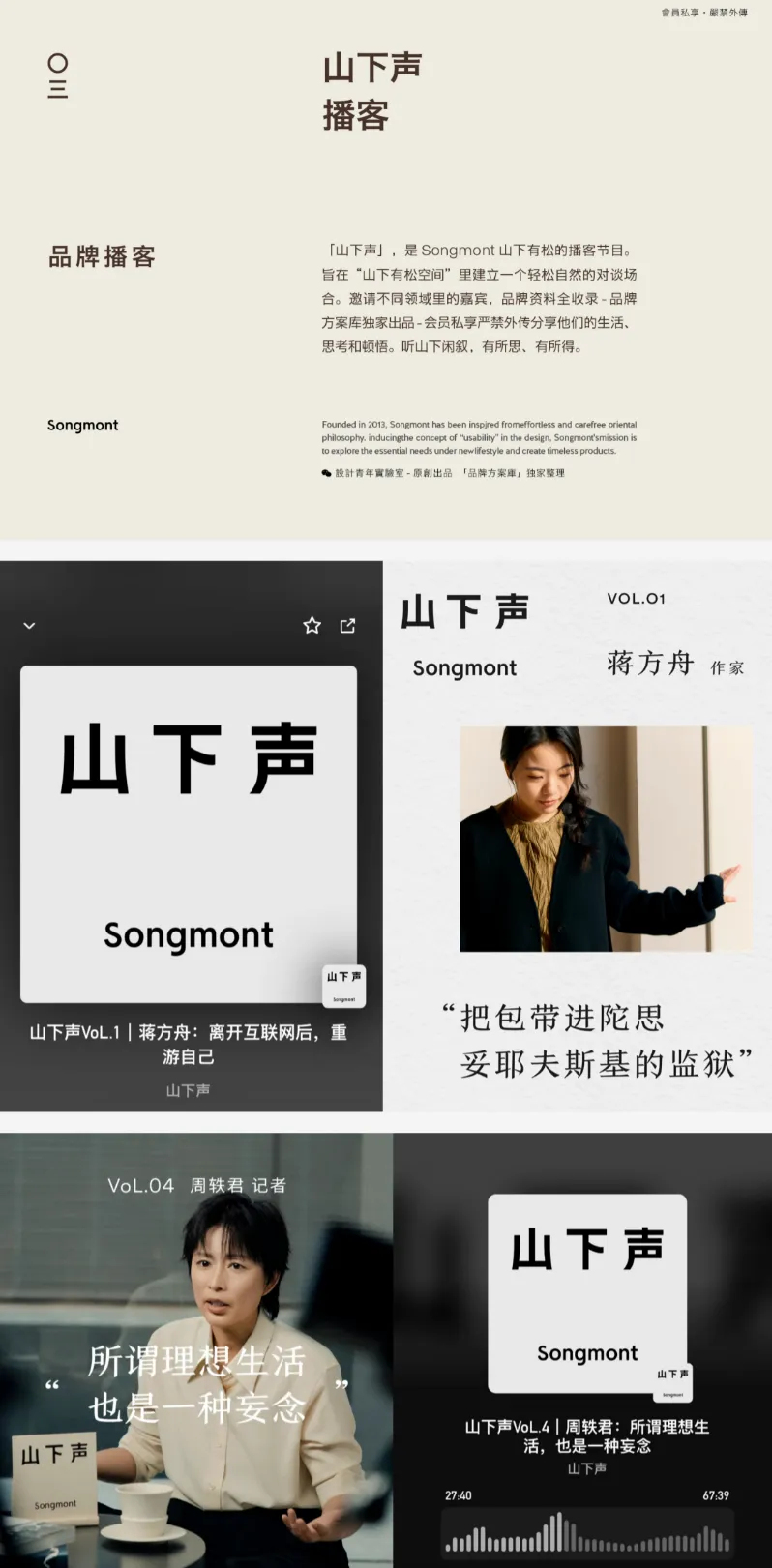 通过与 KOL 博主、明星艺人合作,开设 “山下声” 内容专栏,邀请社会名人、代表社会群体一隅的人物以及用户、姥姥团等参与品牌发展相关人士进行人物访谈等内容创作,塑造品牌东方哲学的理念,强调产品的实用美学。此外,还通过参加上海时装周、设计北京等展会,以及开设线下门店、拓展海外市场等方式进行品牌推广。