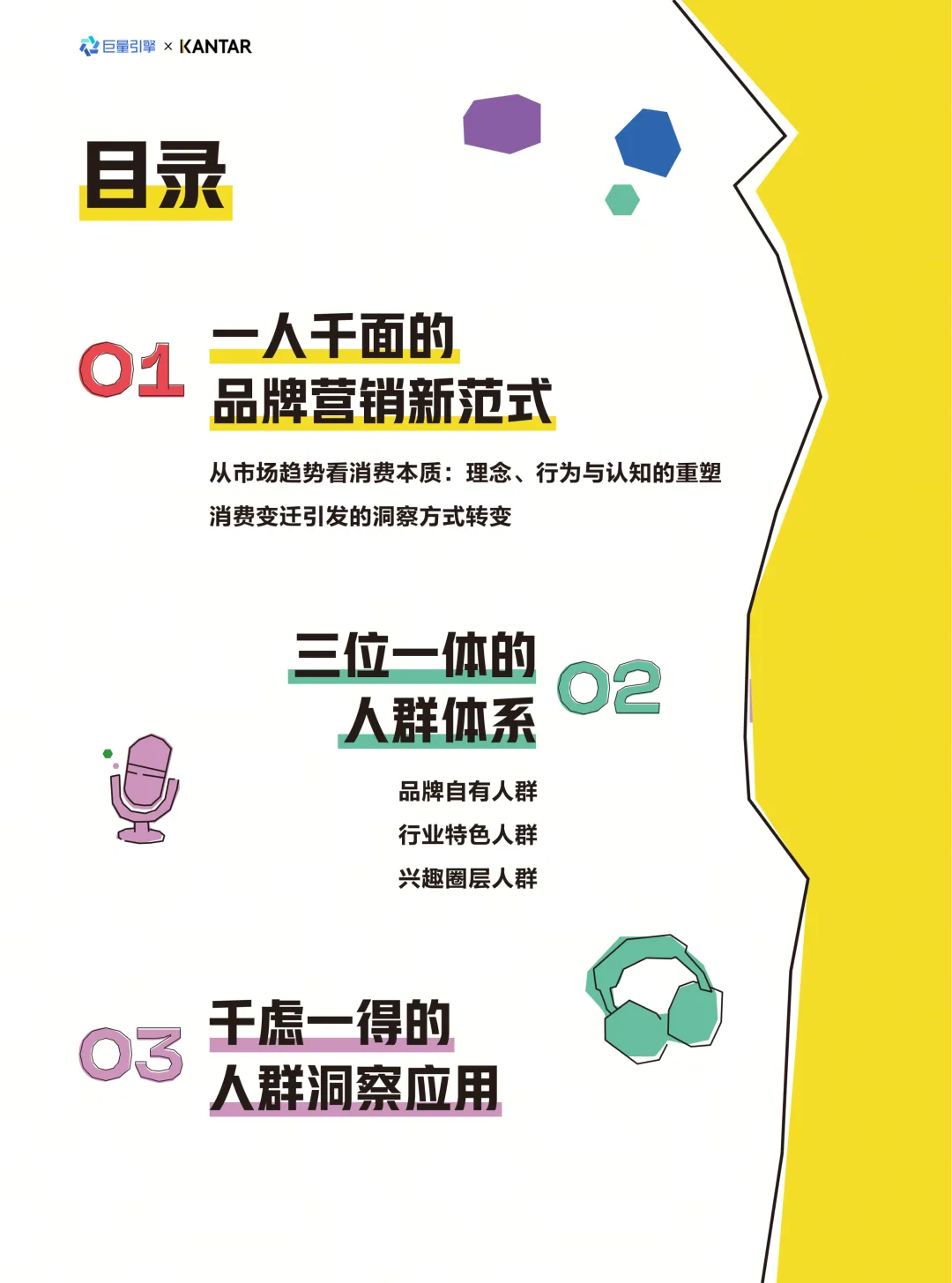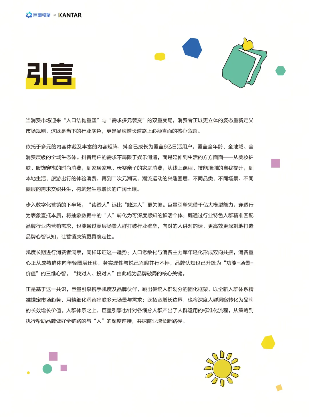 《锚定真实的人——2026人群白皮书》是巨量引擎携手凯度(KANTAR)发布的消费者洞察研究报告。报告旨在回应消费市场“人口结构重塑”与“需求多元裂变”的双重变局,强调品牌增长的核心在于深度理解消费者。报告指出,抖音平台已成长为覆盖6亿日活用户的全域生态体,用户需求延伸到生活各方面,为生意增长提供了广阔土壤。步入数字化营销下半场,“读透人”远比“触达人”更关键。报告基于消费趋势变迁,提出了从“千人一面”到“一人千面”的品牌营销新范式。这一范式的底层逻辑是锚定真实的人,实现从“覆盖规模”向“个体价值深耕”的核心跃迁,驱动数据能力、技术基建、用户运营思维的升级,最终实现从“流量转化”到“用户资产长期运营”的转变。