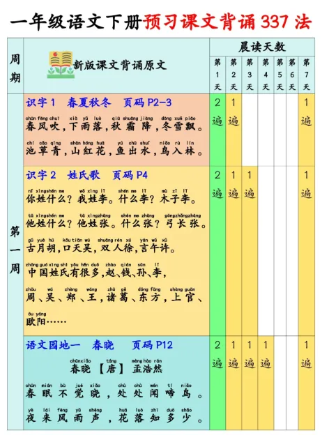 一年级下语文预习课文背诵,高清无水印电子版附链接可下载打印。