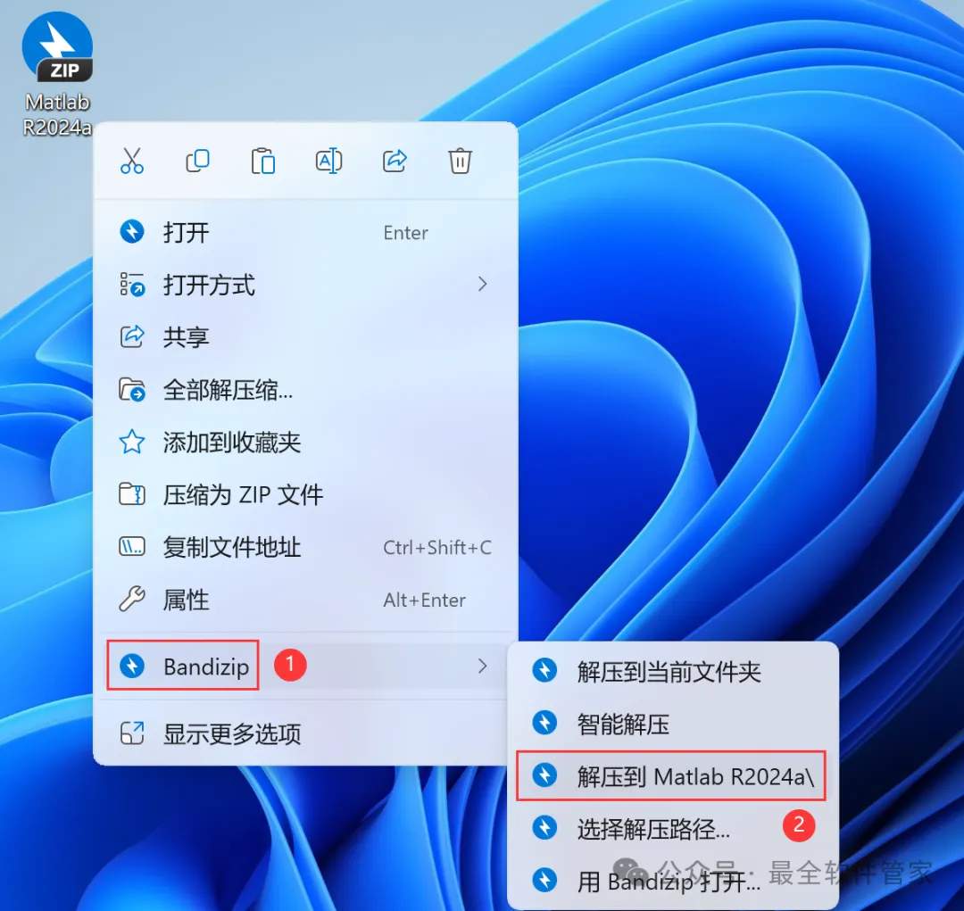 1、下载Matlab R2024a软件安装包到电脑上,右键选择【解压到Matlab R2024a\】