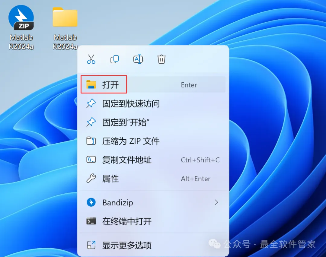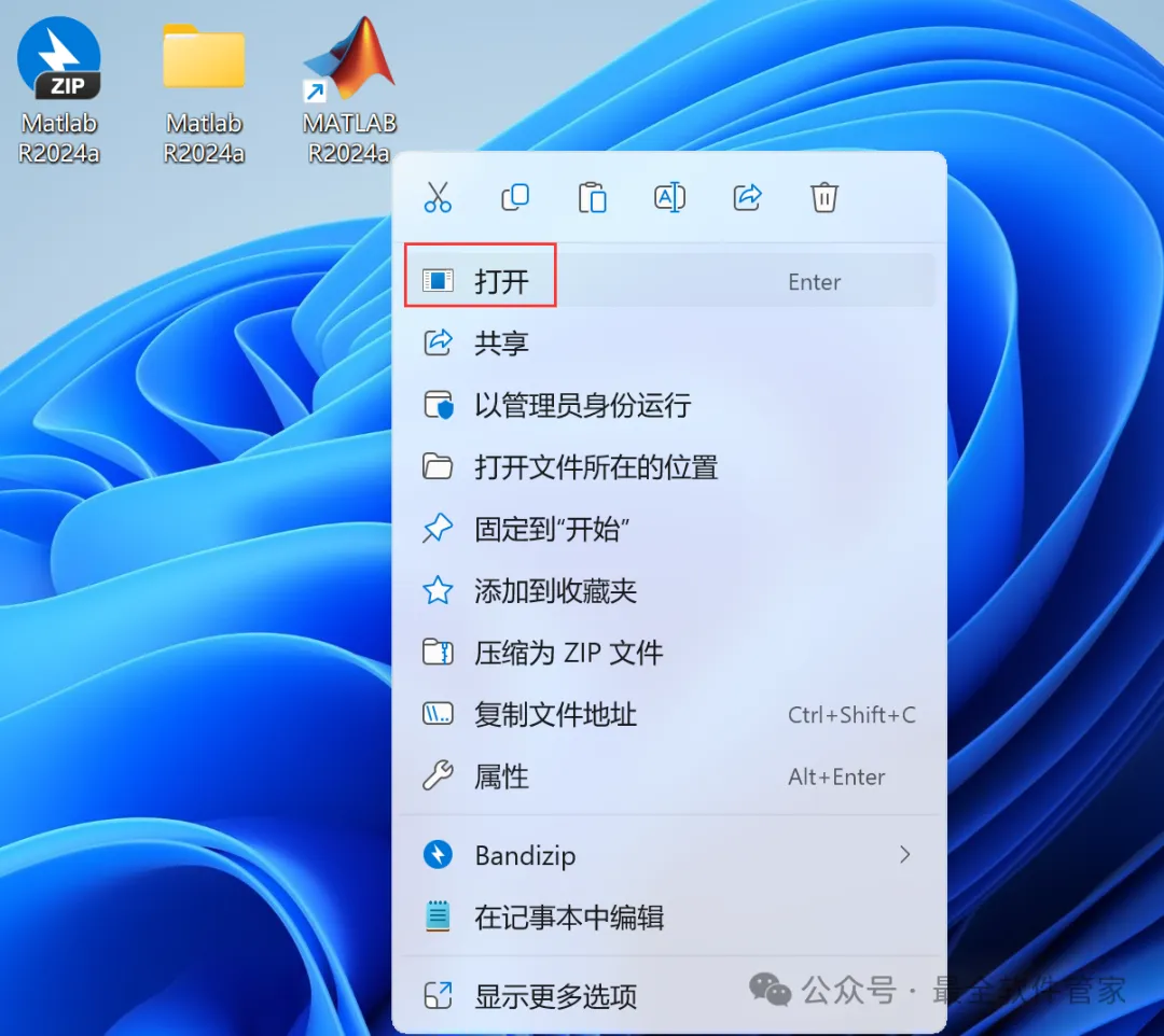 22、回到桌面,右键桌面上的【Matlab R2024a软件图标】,点击【打开】