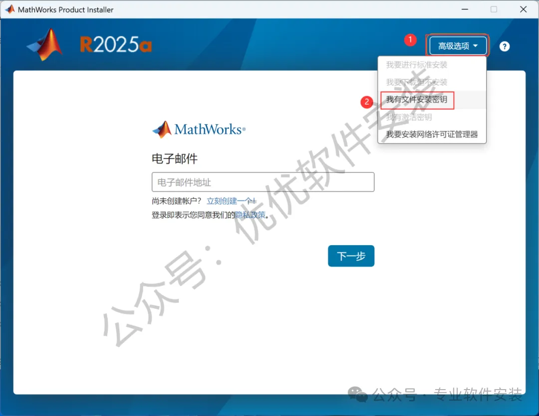 5、依次点击【高级选项】、【我有文件安装密钥】
