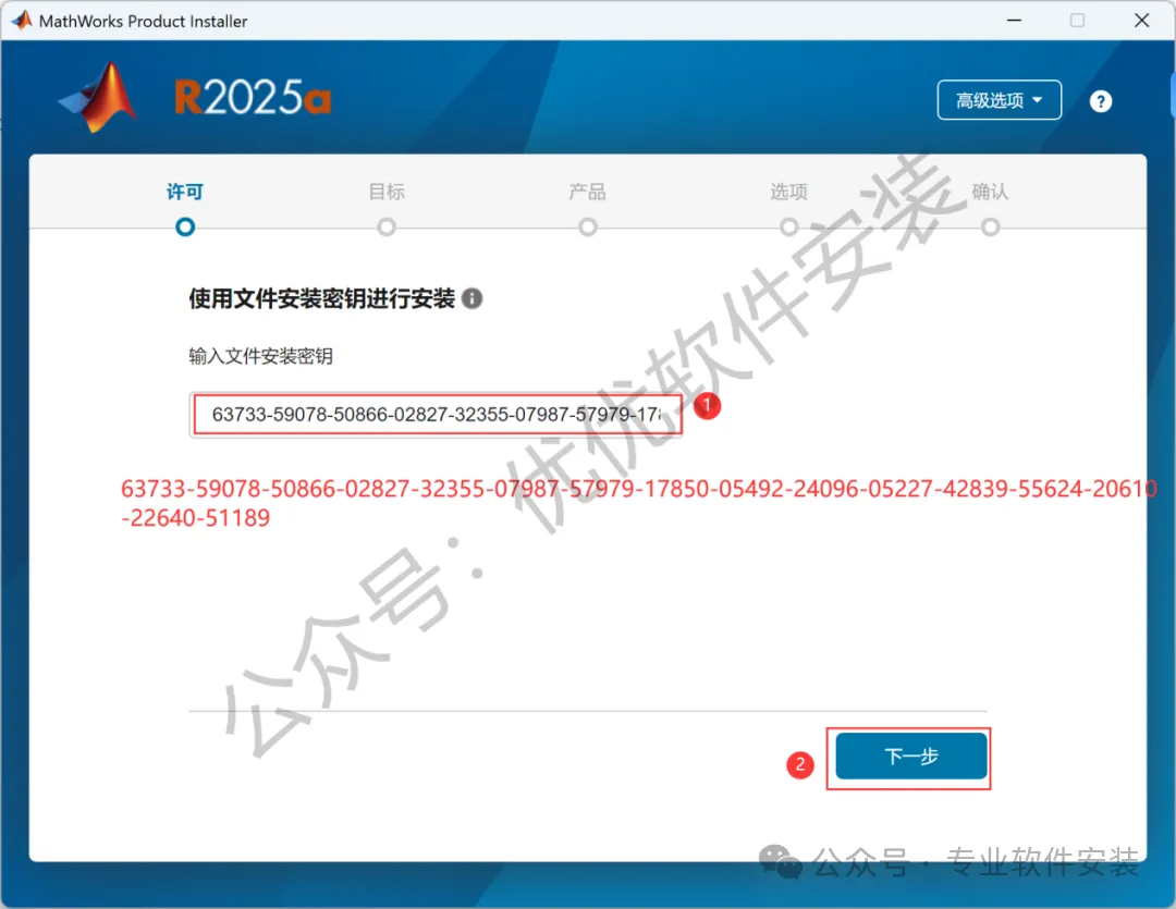 7、输入安装密钥:63733-59078-50866-02827-32355-07987-57979-17850-05492-24096-05227-42839-55624-20610-22640-51189,再点击【下一步】