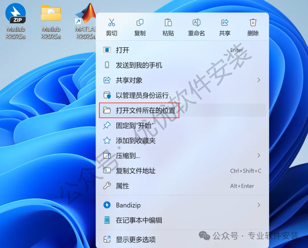 19、回到桌面,右键桌面上的【Matlab R2025a软件图标】,点击【打开文件所在的位置】