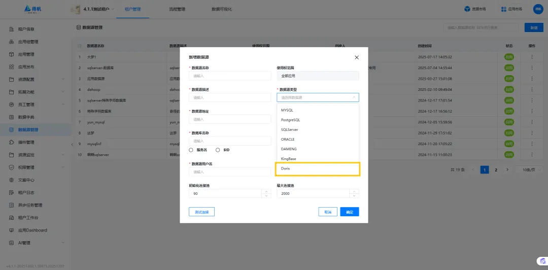 新增高性能库Doris插件,支持数据源新增Doris数据库
