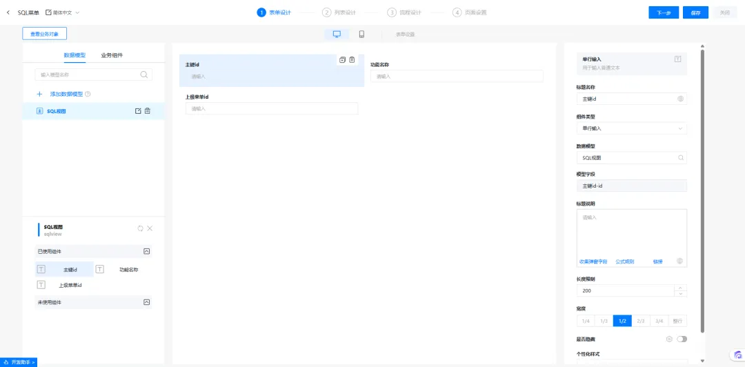 SQL模型菜单的列表设计支持的功能:自定义模版、查询面板、列表字段、视图权限。