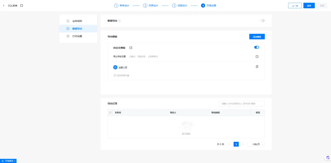 此外SQL模型菜单还支持字段显隐、数据导出、打印设置。