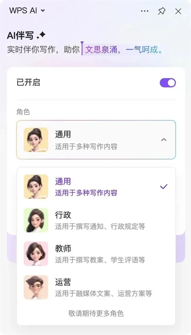 同时,针对传统AI写作“文风僵硬、内容脱离实际、修改成本高”的痛点,WPS AI伴写通过“多角色适配”与“深度意图识别”技术,让AI真正“读懂”用户需求。目前,该功能已提供通用、行政、教师、运营四种不同身份,用户选择对应身份可生成“独特内容”和“关键信息”。