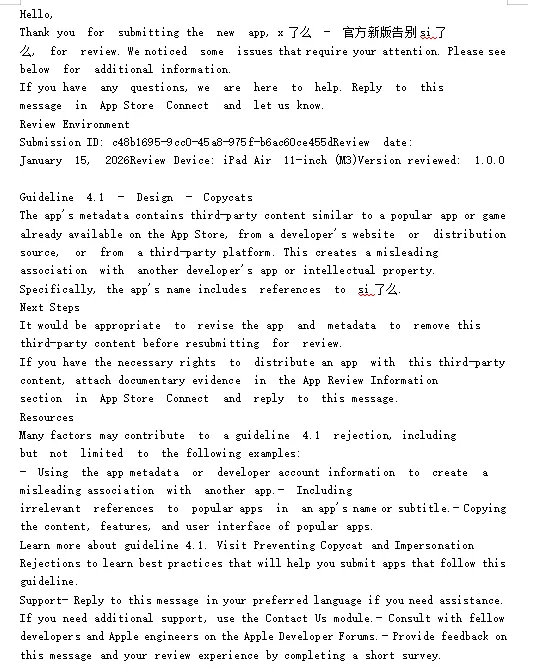 我最近就亲眼见证了一个惨案:某团队搞了个“x了么”,想搭一波“亖了么”的顺风车,结果苹果回复冷冰冰:“你这名字和热门App太像,容易误导用户,涉嫌仿冒。” 依据嘛,就是审核准则第4.1条——专门治各种“抄袭狗”“蹭名怪”。