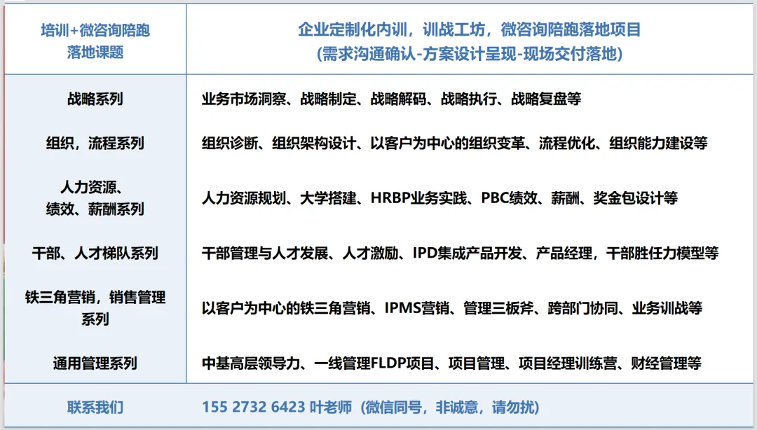 我们长期专注世界级一流企业的科学管理方法论!目前拥有30余位来自原华为、IBM、阿里、字节跳动等全球头部企业的实战管理咨询专家,平均拥有15年以上的一流企业工作经验,构建出15大系列模块课题,向一流企业学经营管理系列研修班,从流程变革、战略、营销MTL、LTC、IPD研发、供应链战略直达绩效、人岗匹配的任职资格、项目管理、干部管理与人才梯队、组织绩效与激励、财经管理等,围绕组织业务增长为主线,课程内容系统、接地气。另根据企业需求定制化训战赋能与深度咨询,长期陪跑服务,业绩对赌协议等,构建以业务为驱动的端到端管理体系,打造企业在极具竞争力的商业环境中去实现完美的人效管理。