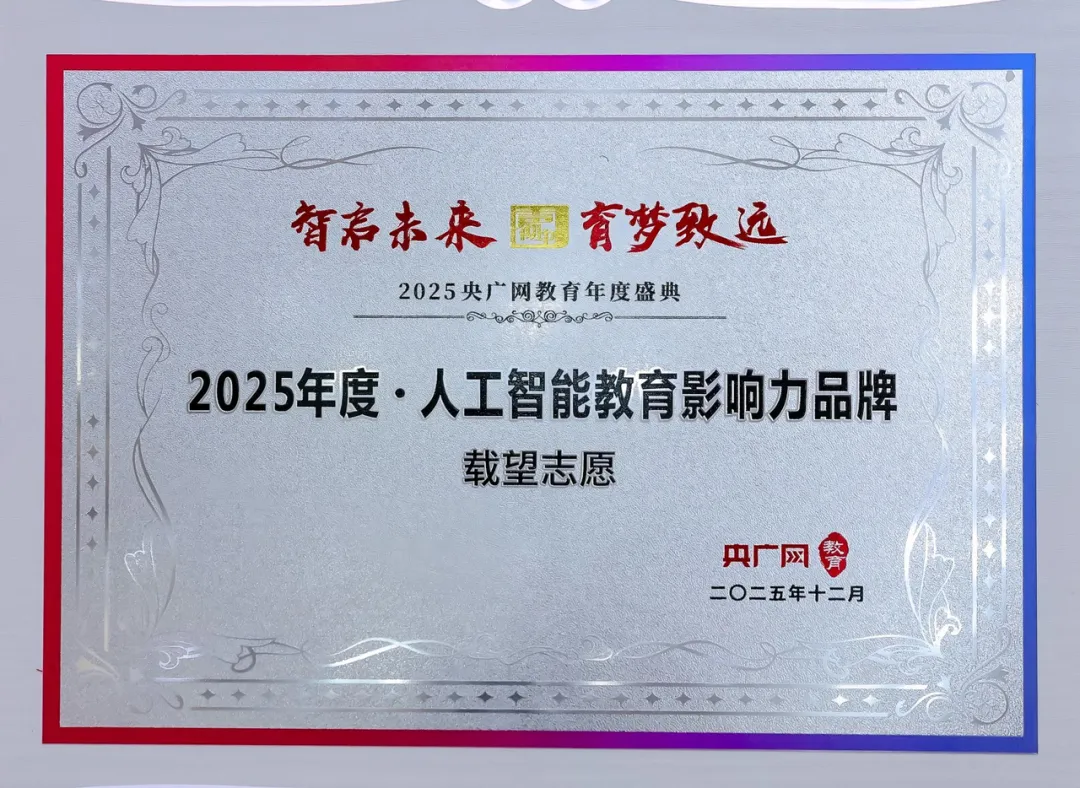 2025年,载望志愿品牌影响力持续获得认可,先后荣获“中国教育行业3.15消费者放心品牌”“中国教育行业最具影响力品牌”及“央广网人工智能教育影响力品牌”等称号。