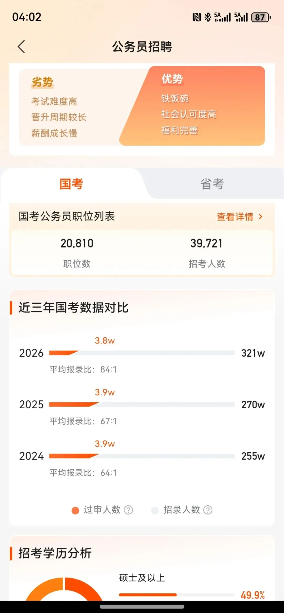 在“公务员”模块, 则系统整合了国考与各省省考近三年的招录数据。考生可以查询特定专业(如法学、汉语言文学)在公务员系统中的招录岗位数量、竞争比趋势,甚至可以下钻到具体省份和部门查看详情。